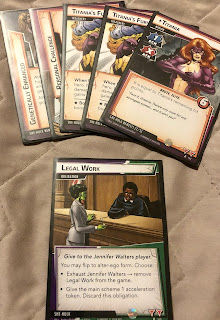 Legal Work card is then discarded - the card effect(s) do not happen and (in some ways) I luck out at having the She-Hulk's obligation card dismissed right off the bat. Sure, it caused the Rhino's attack to basically do twice as much damage, but She-Hulk is tough, she can handle it. There are no minions to attack me, so this phase is done.